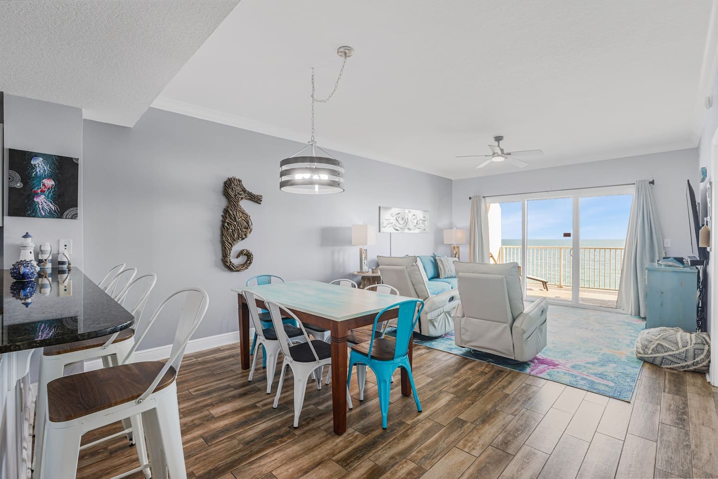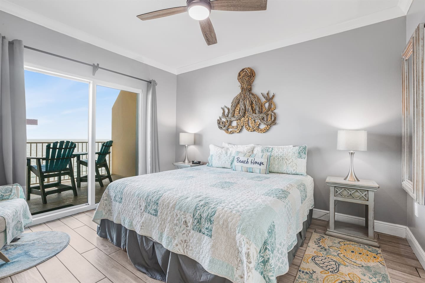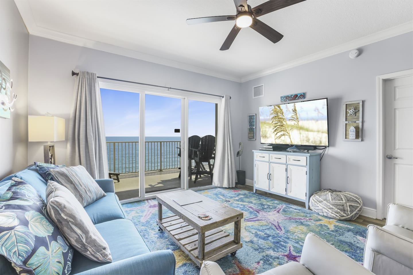 Waves of Happiness is a 2-bedroom, 2-bathroom condo that accommodates up to 6 guests, located directly on the Gulf of Mexico. Enjoy the ultimate beach getaway at this beautiful condo. Step inside to stunning Gulf views through large windows and your private balcony. The spacious open concept living and dining area is perfect for relaxing and spending time with loved ones. Centrally located near restaurants, shopping, and activities.