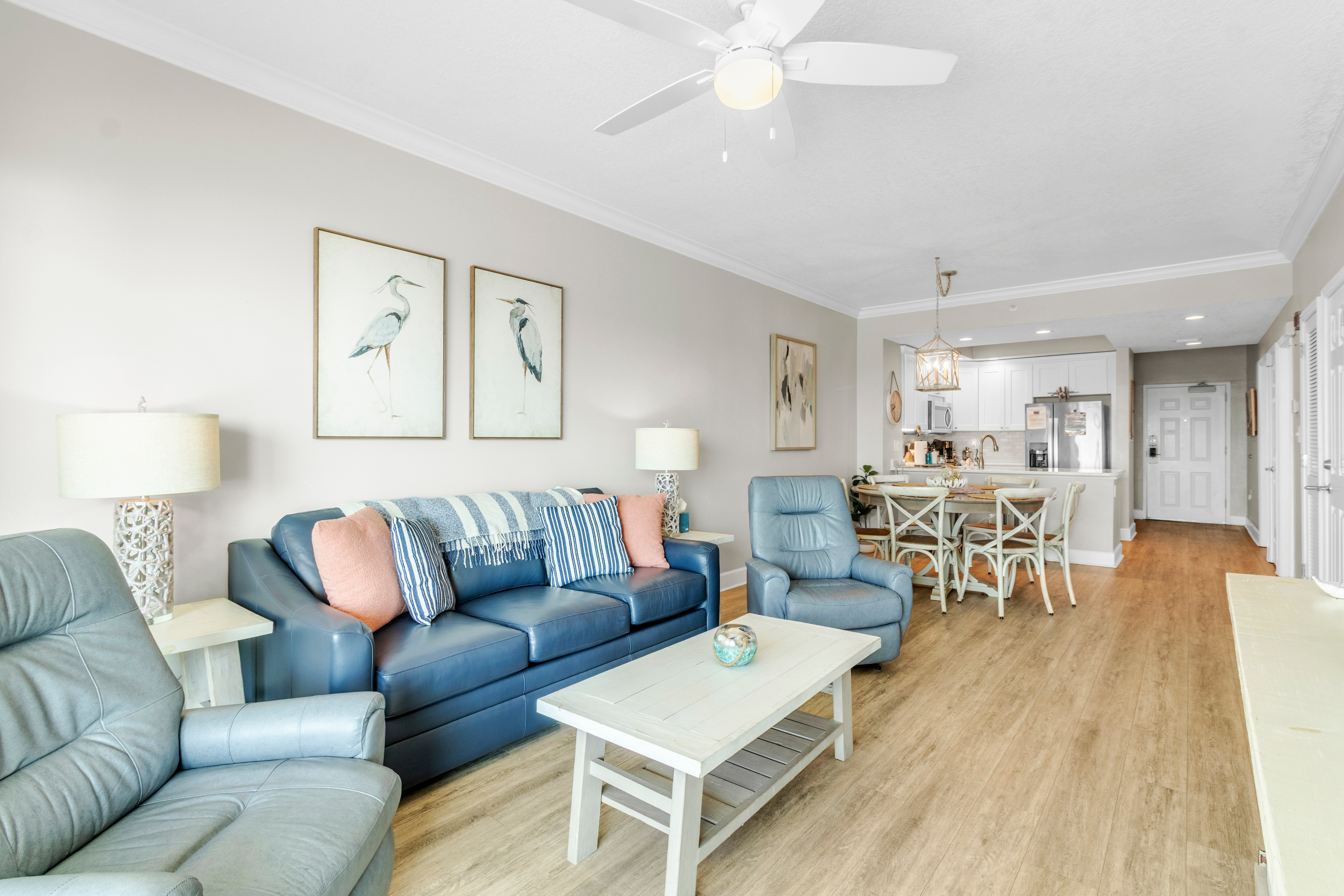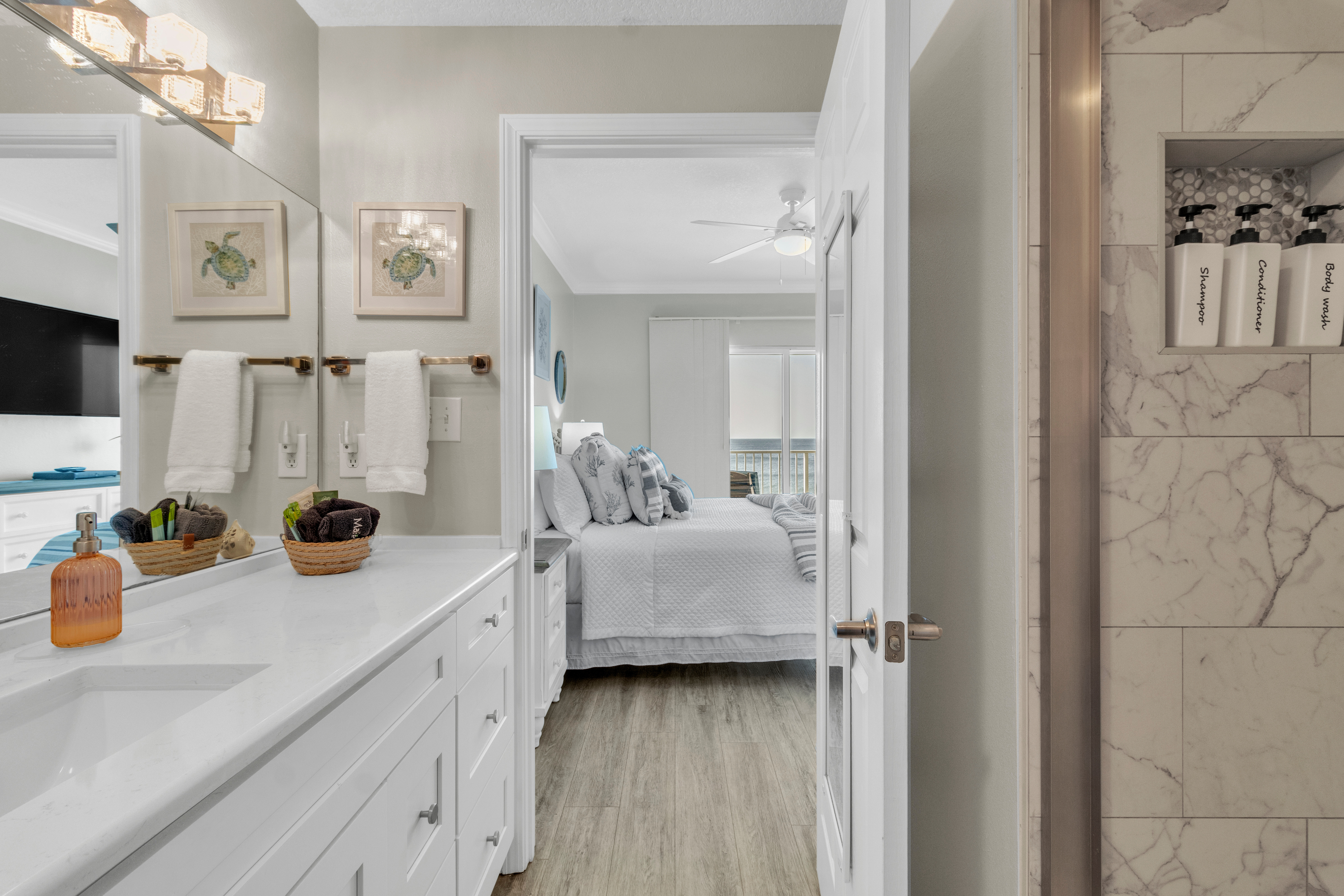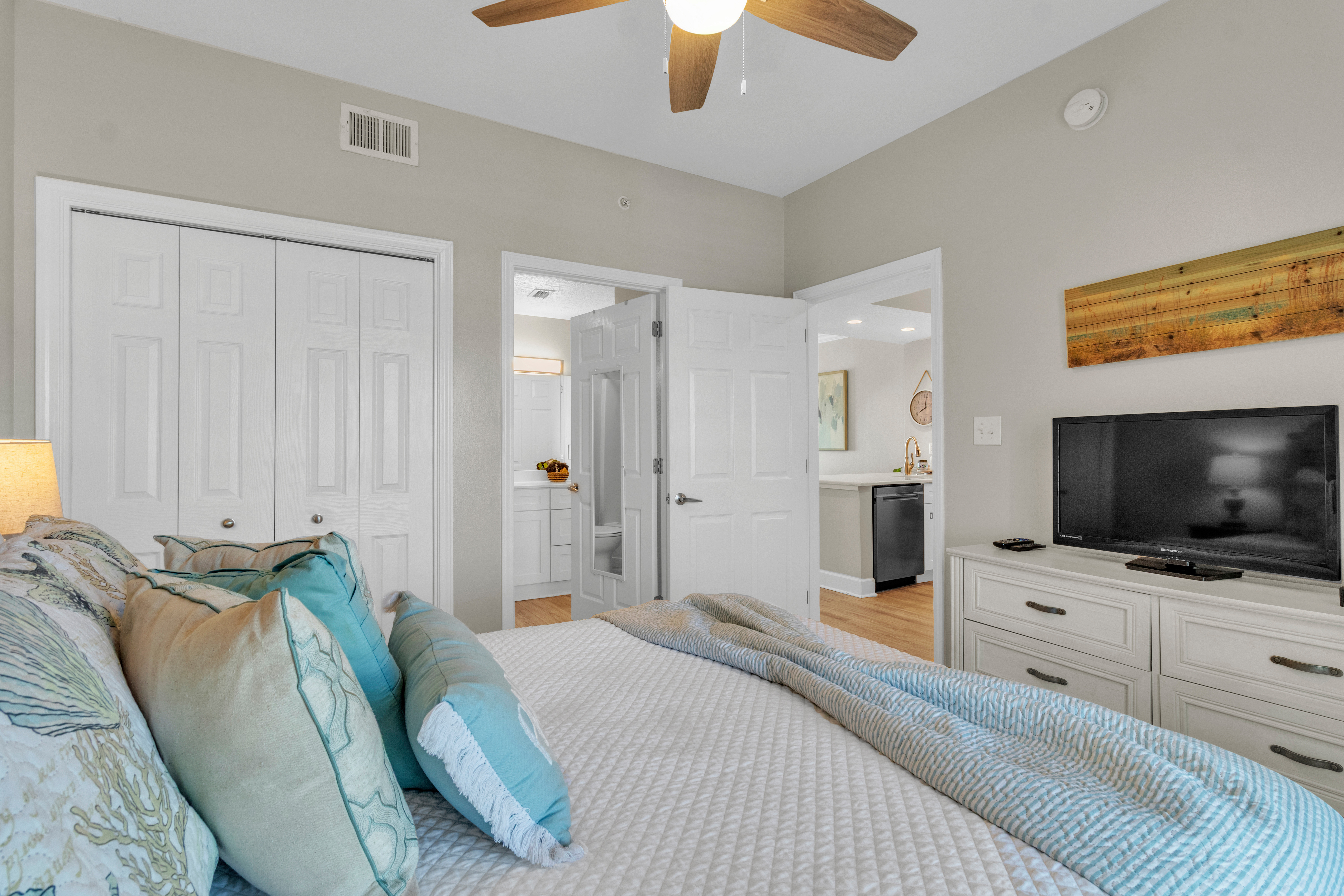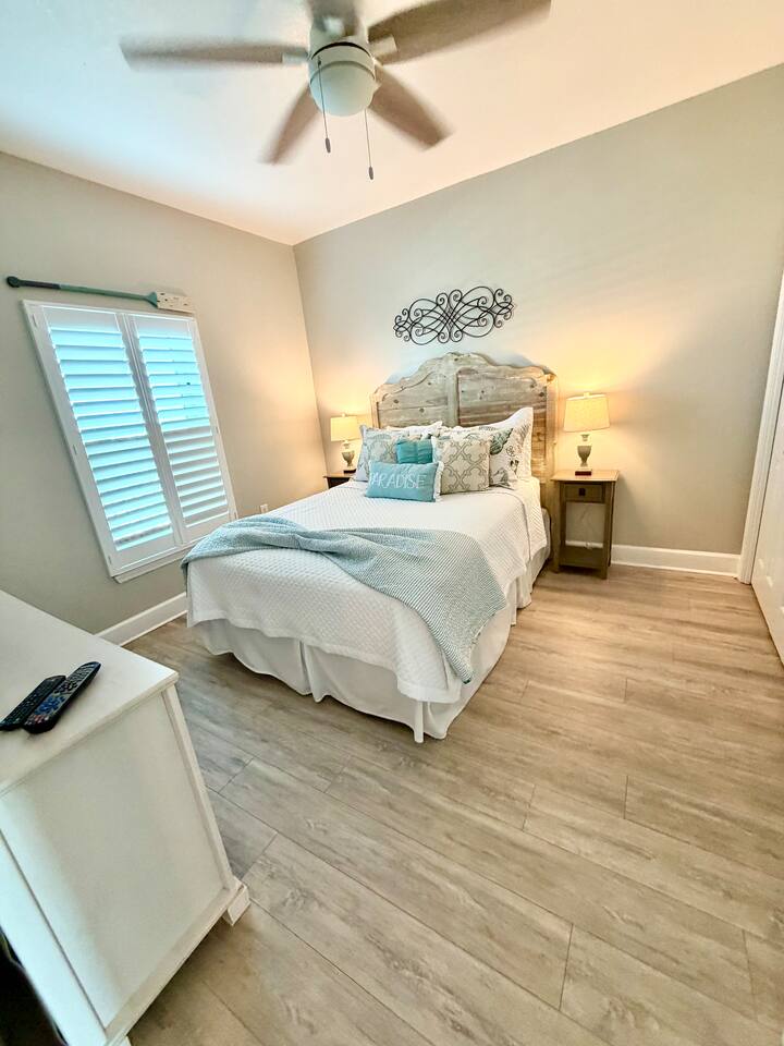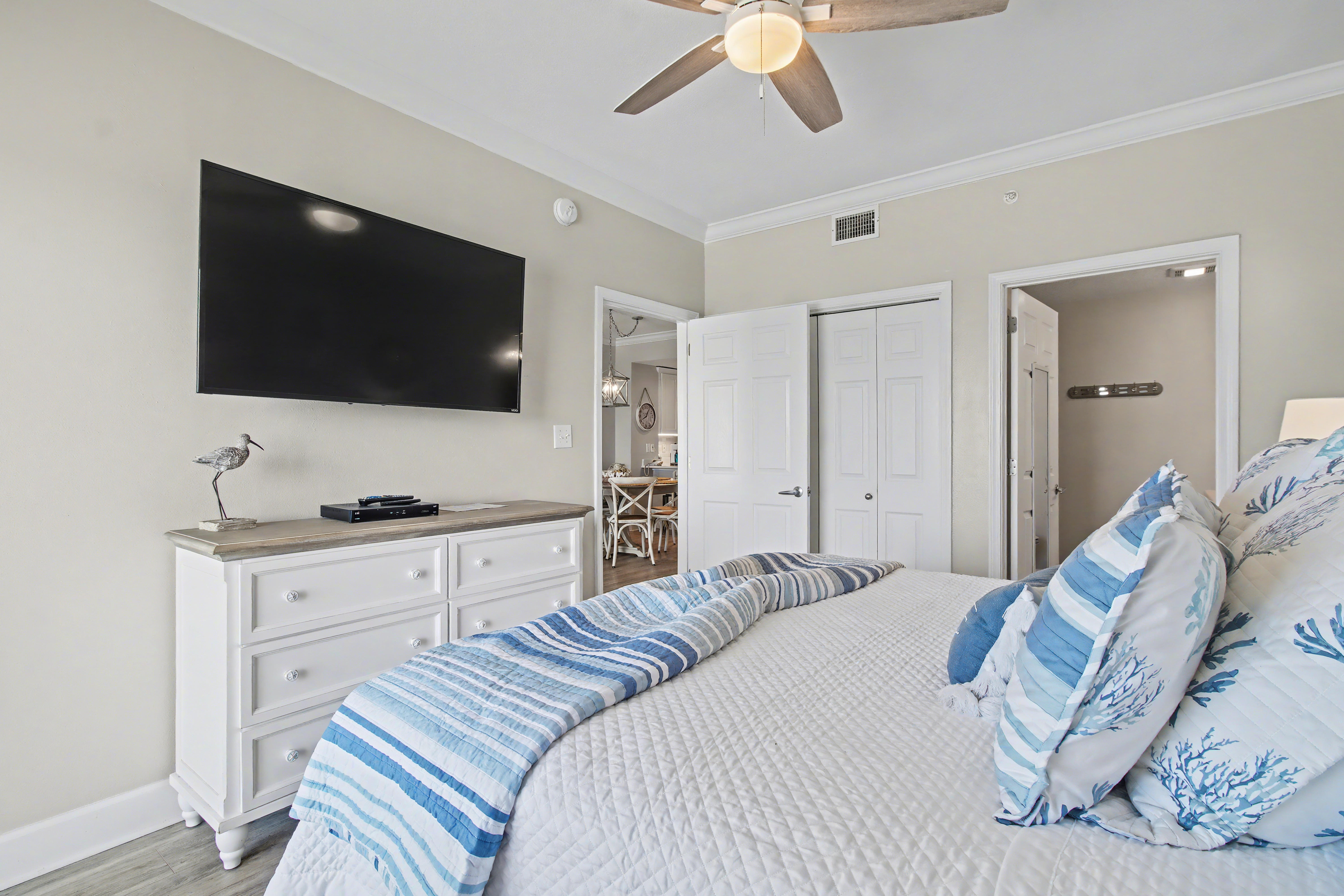 This home offers two bedrooms and two bathrooms, including a primary suite with a private en-suite bath featuring a walk-in shower. The guest bedroom has convenient access to a shared Jack-and-Jill bathroom. Located at a family-friendly beachfront complex, guests enjoy direct beach access via secure key-fob entry. Resort-style amenities include an indoor and outdoor heated pool, hot tub, sauna, fitness center, game room, community BBQ area, elevators, and covered assigned parking.