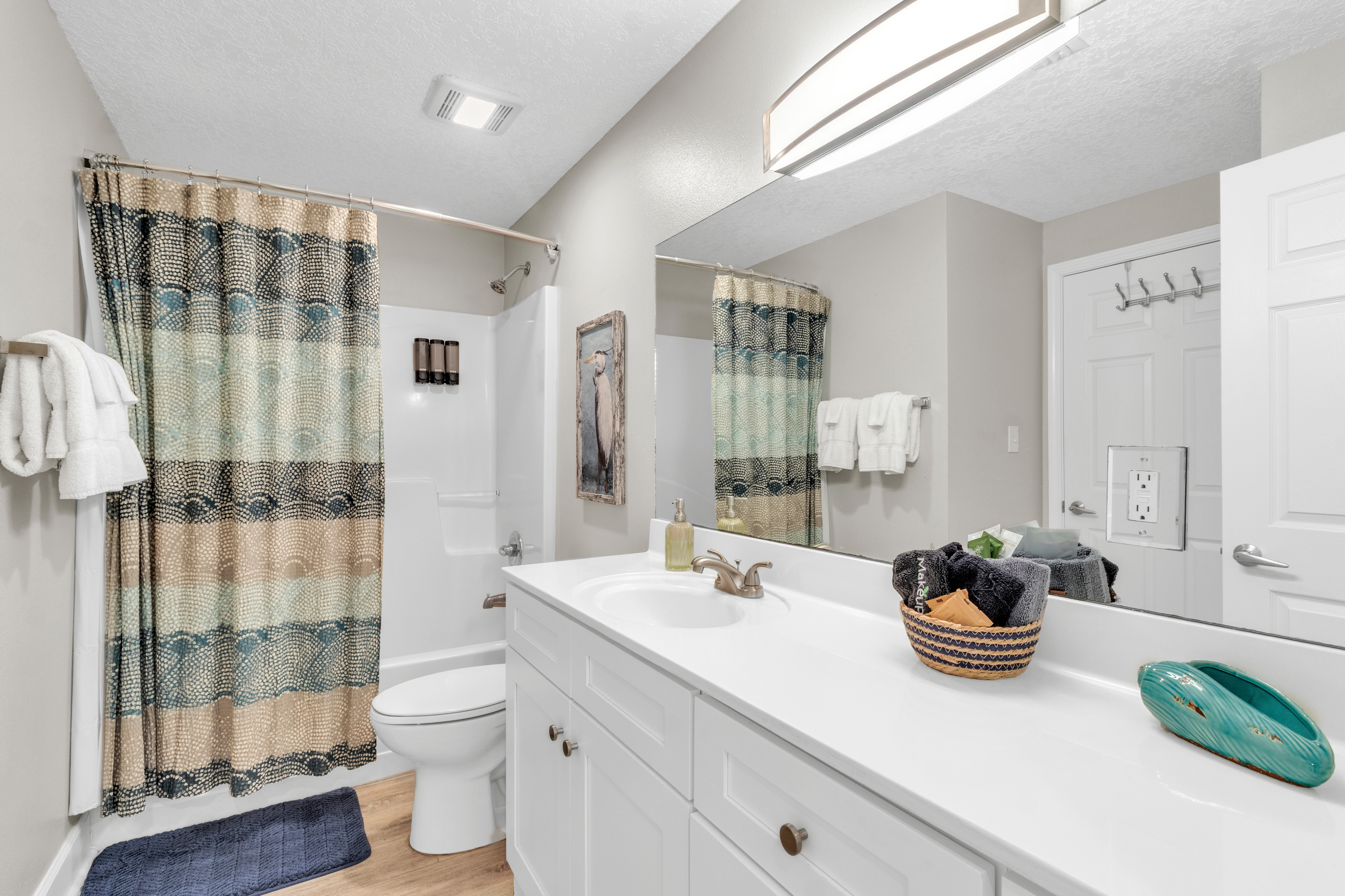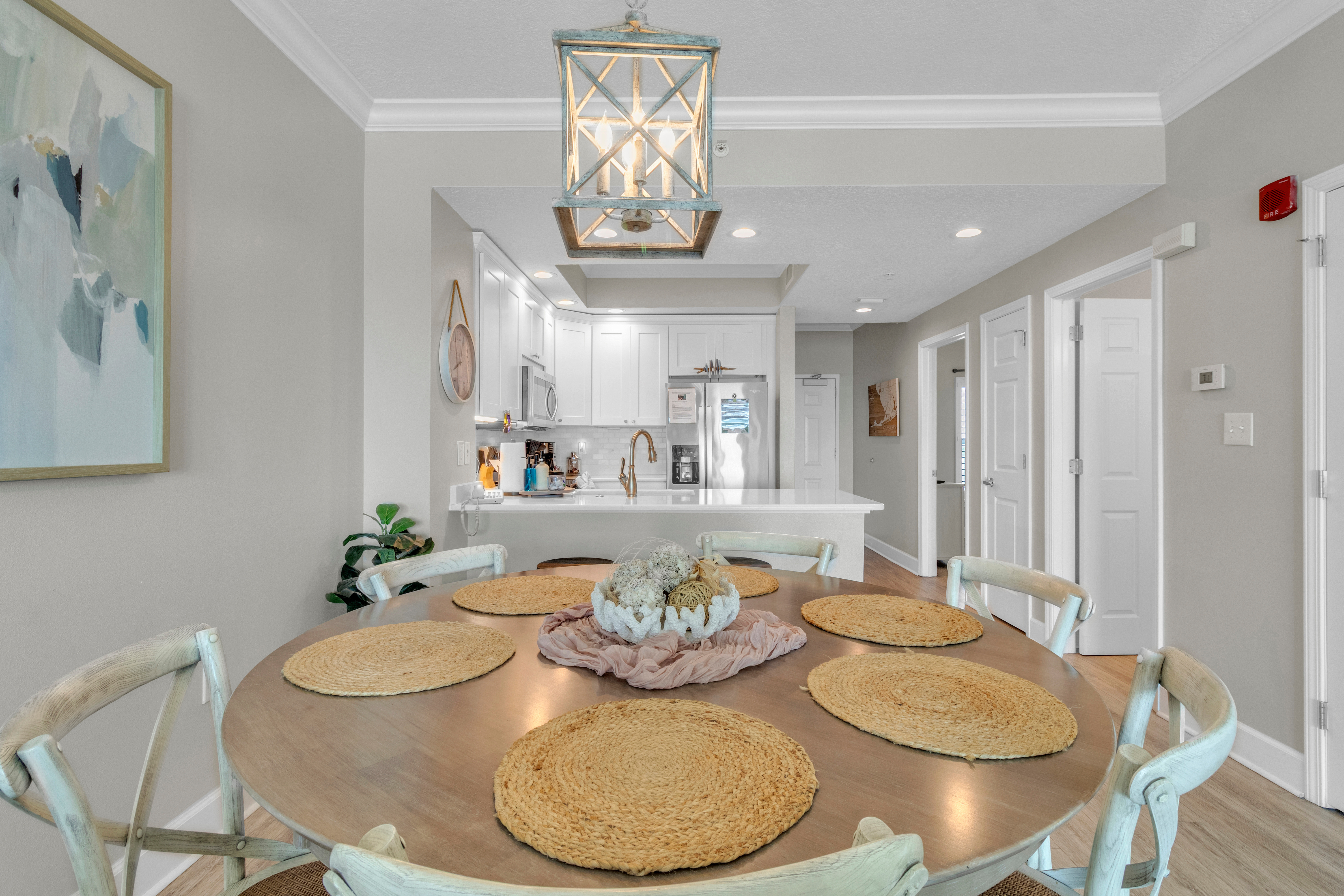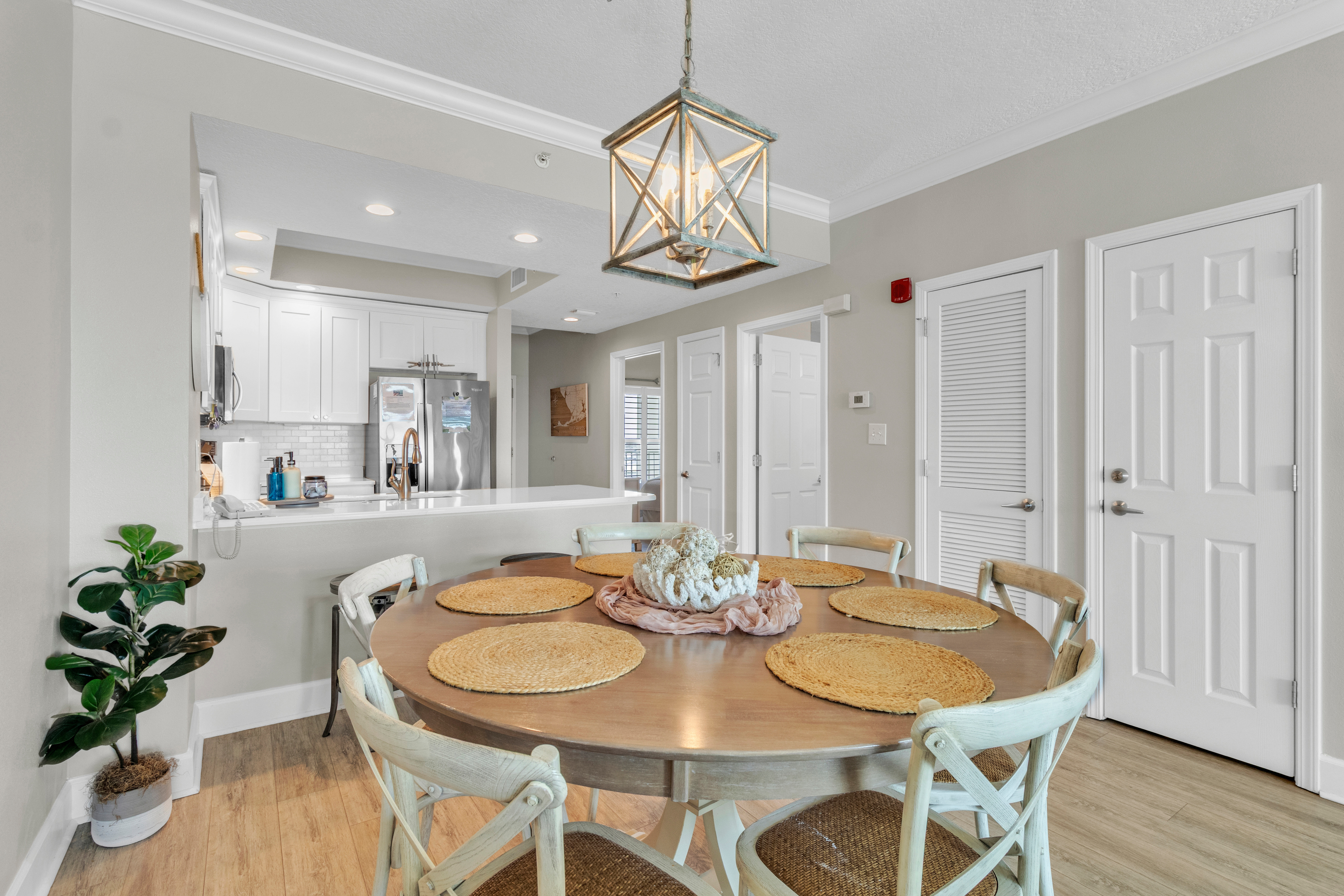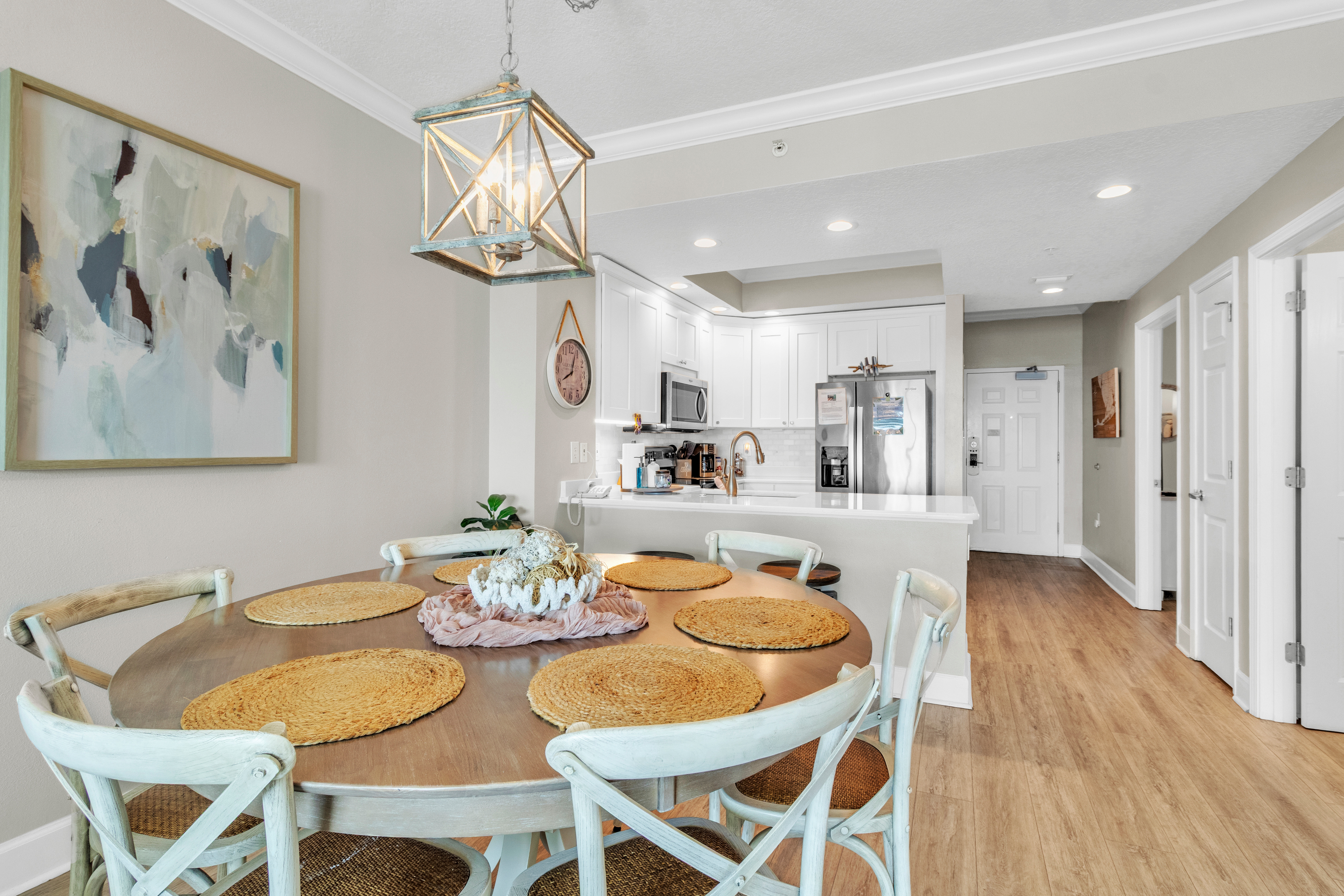 This home offers two bedrooms and two bathrooms, including a primary suite with a private en-suite bath featuring a walk-in shower. The guest bedroom has convenient access to a shared Jack-and-Jill bathroom. Located at a family-friendly beachfront complex, guests enjoy direct beach access via secure key-fob entry. Resort-style amenities include an indoor and outdoor heated pool, hot tub, sauna, fitness center, game room, community BBQ area, elevators, and covered assigned parking.